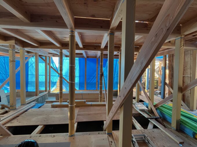 上棟直後のこれらのたくさんの写真からもわかりますが、柱にこれでもかと養生の紙が